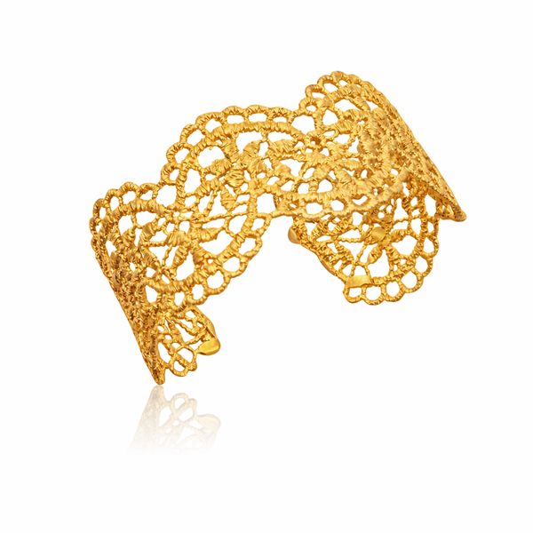 A tribute to the intricate beauty of handcrafted textiles, the Amyrsa Cuff is a celebration of femininity and heritage. Its floral motifs bloom in 22k gold-plated 925 silver, embodying both grace and resilience. A piece that feels like a whisper of the past, carried into the present—a reminder that true beauty is woven from memories, artistry, and the ties that connect us.