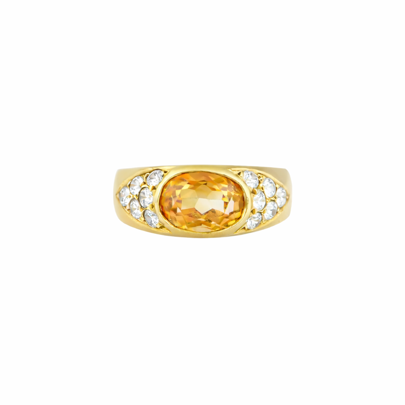Radiant and bold, the Cassia Ring features an oval-cut citrine bezel-set at the center of a polished 18k gold band. Framed on both sides by pavé-set white diamonds, the rich warmth of the gemstone is amplified by its luminous setting. Meticulously handcrafted, this ring combines classic elegance with a touch of vintage glamour.