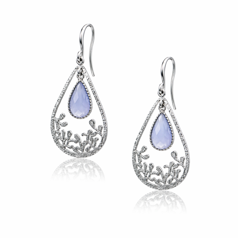 Delicate and radiant, the Celeste Earrings embody ethereal elegance. Plated in 925 Silver, these teardrop-shaped earrings frame a luminous, faceted violet hydro crystal that catches the light with every movement. The open teardrop is accentuated by ornate botanical motifs, intricately rendered to evoke a sense of nature’s quiet beauty. Suspended gracefully, the central gem adds a sparkling focal point, making these earrings a refined choice for both daytime elegance and evening allure.