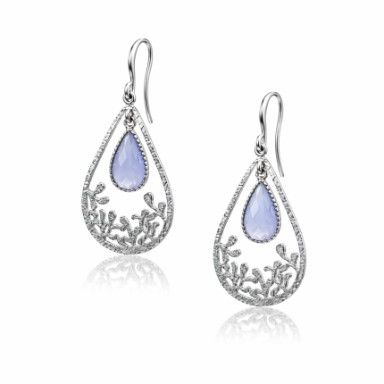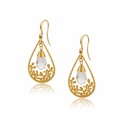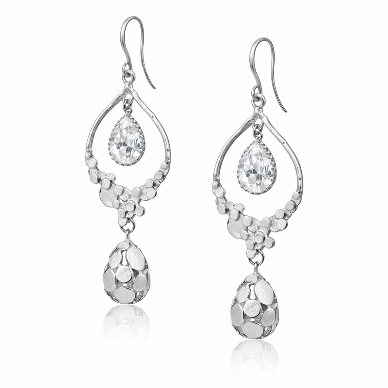 Elegant and poetic, these handcrafted earrings capture the essence of delicate artistry. Plated in sterling silver, their design features a teardrop-shaped cubic zirconia, gracefully suspended within a sculptural gold frame. The frame is adorned with intricate circular accents, lending a textured appeal. Below, a hollow drop formed by a cluster of golden circles sways gently, adding movement and dimension to the design. A perfect balance of refinement and charm, these earrings bring a luminous touch to any occasion.