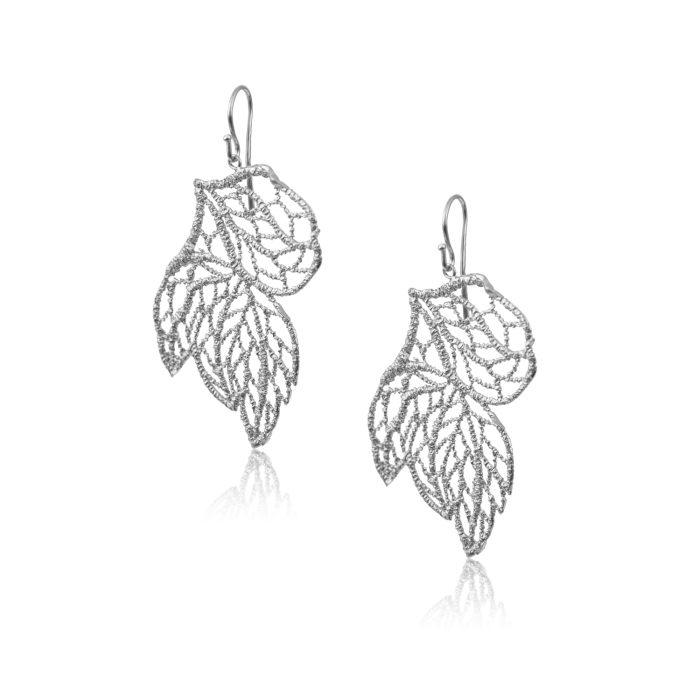 Dramatic and sculptural, the Flevia Silver Earrings draw inspiration from lace leaf motifs, rendered in shimmering silver. Crafted by capturing real lace in wax and casting it in silver, they preserve every delicate thread. Their flowing silhouette adds elegance and modernity to any look.