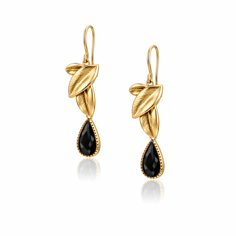 The Foliare Gold Earrings showcase delicate golden leaves flowing into a faceted black onyx teardrop crystal. With a design that captures the beauty of nature, these earrings are a dreamy accent for feminine, everyday elegance or special events with a floral touch.