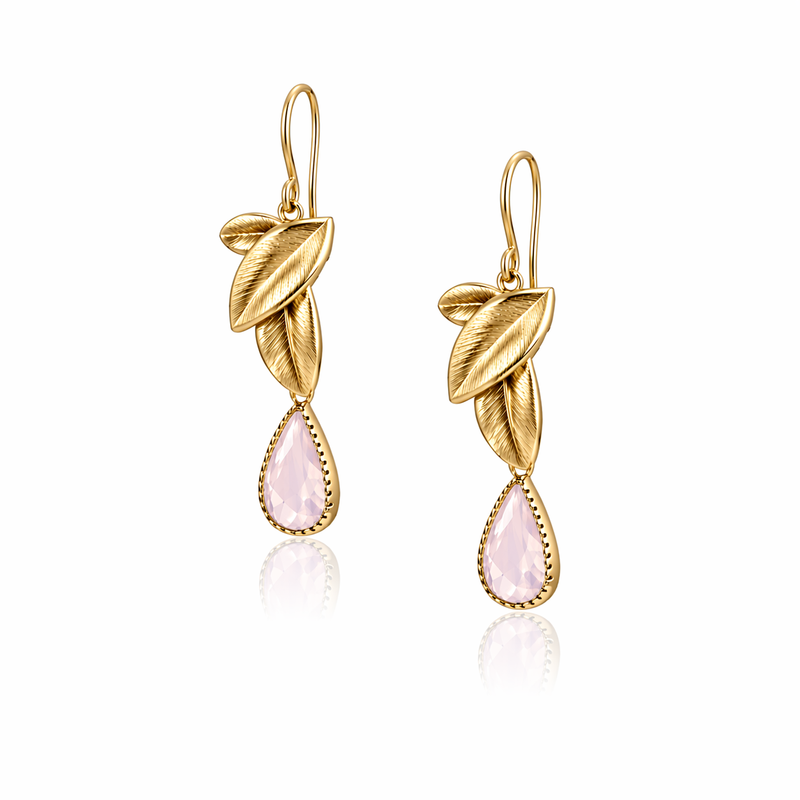 The Foliare Gold Earrings showcase delicate golden leaves flowing into a faceted opal pink teardrop crystal. With a design that captures the beauty of nature, these earrings are a dreamy accent for feminine, everyday elegance or special events with a floral touch.
