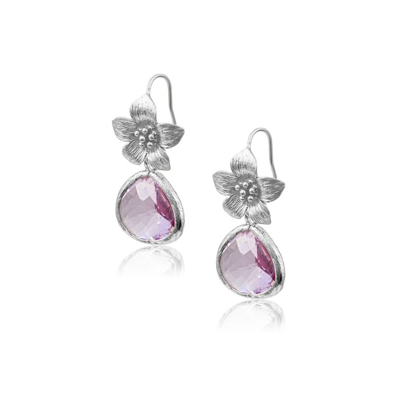 Floral and fresh, the Hibiscus Earrings bloom with romantic charm. Delicately sculpted silver hibiscus flowers crown each piece, detailed with softly brushed petals and a textured center. Below, a beautifully faceted lavender-purple besel dangles, capturing the light with subtle brilliance. The color pairing evokes spring’s awakening, while the artisanal details ensure a timeless allure. These earrings are a celebration of botanical grace and artistic finesse.