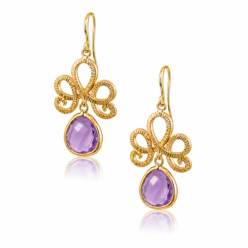 Refined and radiant, the Lotus Gold Earrings bloom with symbolic beauty. A trio of sculptural loops sits atop a lavender-purple, faceted crystal, capturing the essence of the lotus flower—grace rising from stillness. These earrings bring balance, elegance, and a serene pop of color to your jewelry collection.