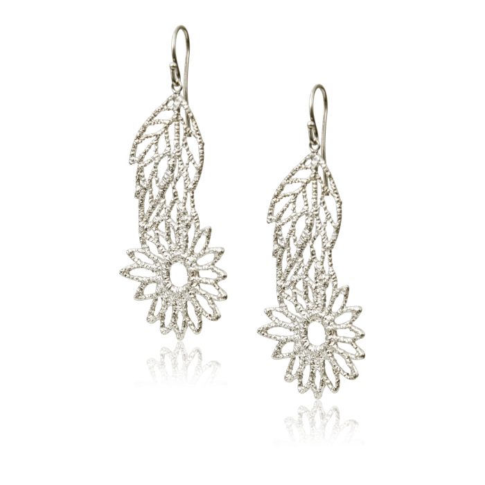 Bold yet airy, the Margarita Silver Earrings – Open Bloom unfurl like radiant sunflowers with an openwork heart at the center. Their floral lace motif, framed by delicate leaves, is handcrafted using the lost wax technique from real lace, preserving every thread-like detail in shimmering sterling silver. Light and intricate, they embody the elegance of nature in bloom with a softer, more ethereal character than their golden counterpart.