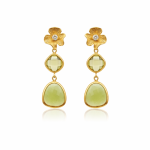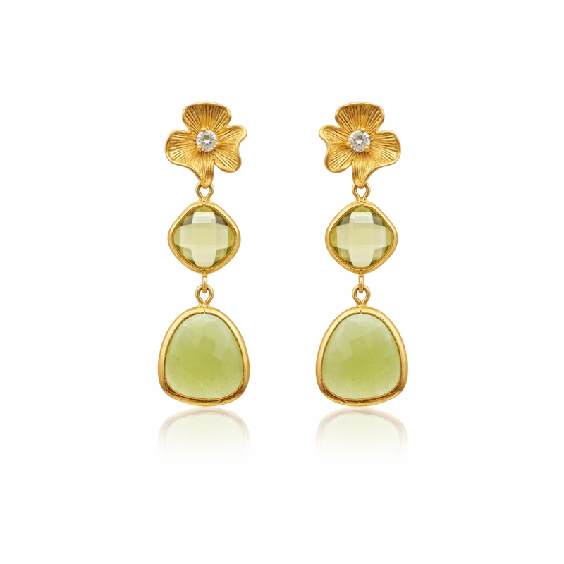 Charming and radiant, the Romance Gold Earrings blend botanical elegance with modern simplicity. A delicate gold flower with a sparkling center anchors the design, followed by two softly faceted green crystals—one cushion-cut, the other organically shaped. Their gentle asymmetry and harmonious peridot green hues evoke the tender balance of love and light. Ideal for both day and evening wear, these earrings bring a fresh, romantic glow to any ensemble.