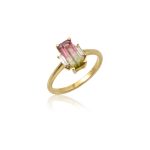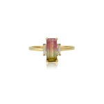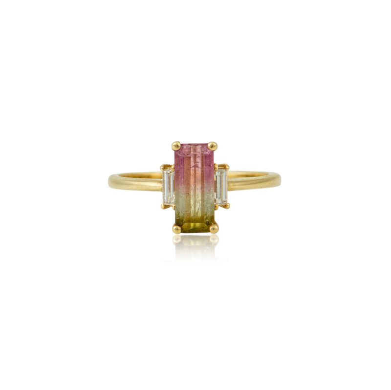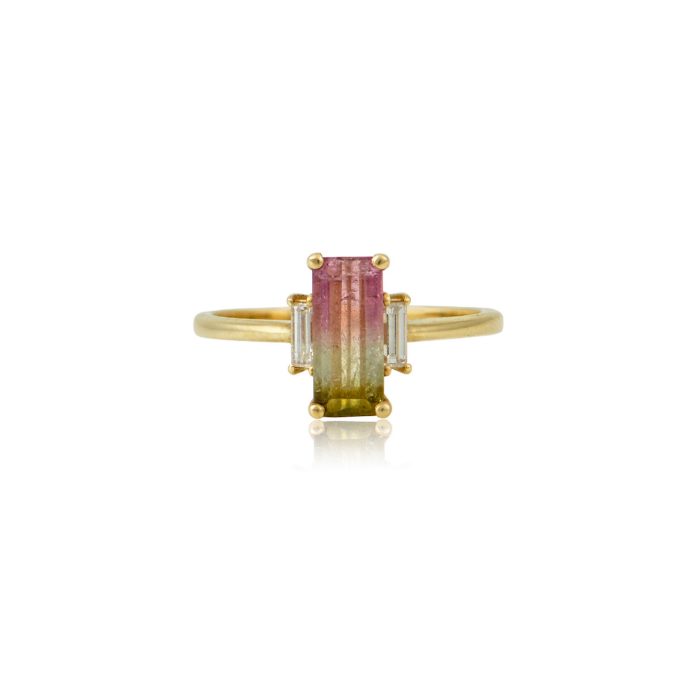 Glowing with soft vibrancy, the Serena Ring features a natural emerald-cut watermelon tourmaline, transitioning seamlessly from blush pink to moss green. Two baguette-cut white diamonds flank the central stone, enhancing its gradient hues with subtle brilliance. Handcrafted in solid 14k gold, this ring balances modern geometry with the organic beauty of a gem born from the earth’s artistry.