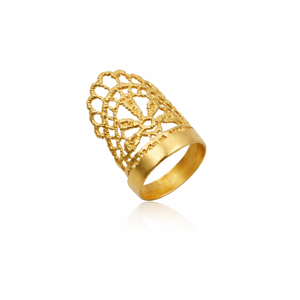 The Myrelia Ring draws its structure from a traditional lace crown, with its tall, arched silhouette and intricate pattern casting delicate shadows across the finger. Sculpted in 22k gold-plated brass, this piece evokes elegance with strength — a piece that commands presence without losing softness.