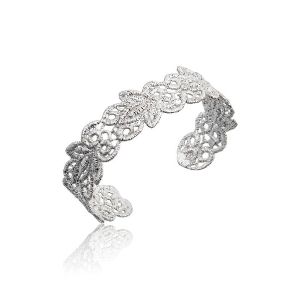 A luminous interpretation of lace turned to metal, the Phaedra Silver Cuff reflects light through its intricate, floral geometry. Crafted in bronze and plated in 925 silver, it carries a quiet elegance — light on the wrist yet rich in detail, echoing heirloom adornments of another era.