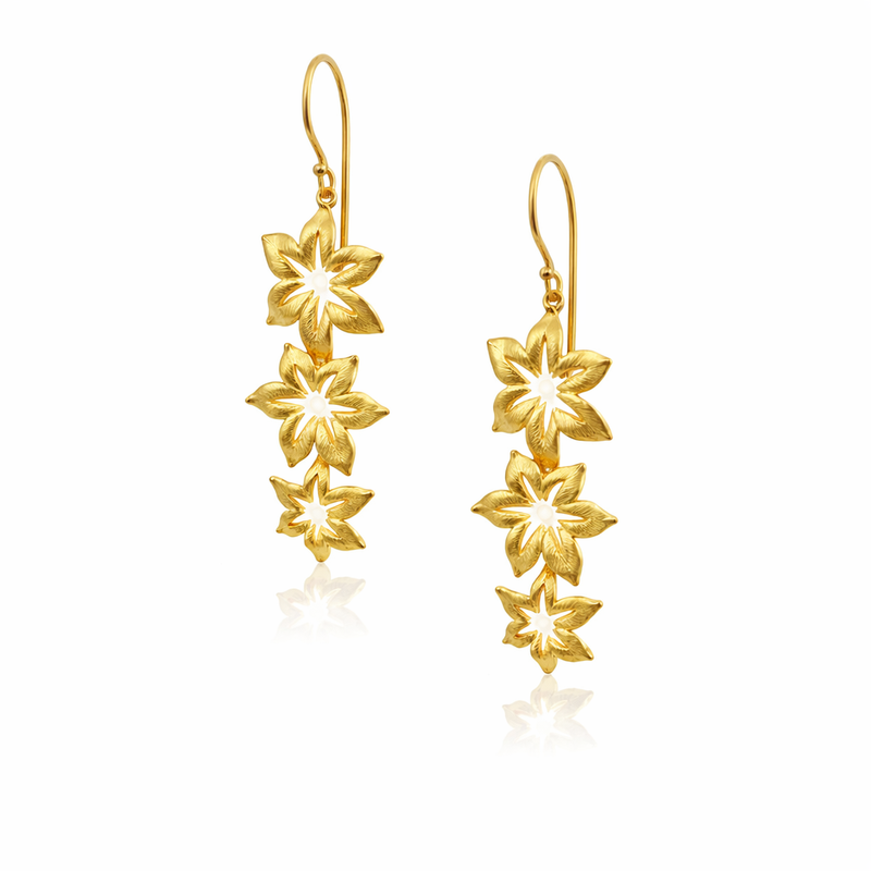 Elegant and ethereal, the Twilight Gold Earrings capture the magic of nightfall. A trio of gold-toned floral silhouettes cascade gracefully. Their layered design creates a dazzling play of light and shadow—perfect for adding a soft shimmer to evening ensembles.