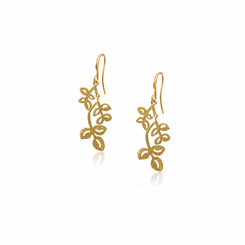 The Vinea Gold Earrings evoke the golden warmth of sunlight through vine leaves. With their organic silhouette and elegant drop, they make a refined yet earthy statement—ideal for adding a luxe, nature-inspired glow to any outfit.