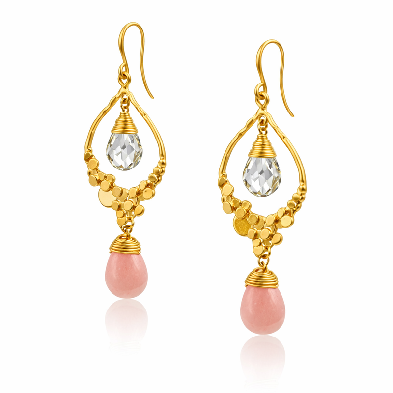 Bold and whimsical, the Wired Chandelier Gold Earrings combine sculptural fluidity with rich color. A faceted wired crystal drop floats in the center, while a warm coral jade dangles below, framed by an openwork golden arc adorned with delicate hammered textures. These radiant earrings add vibrant movement and bohemian charm to any look.